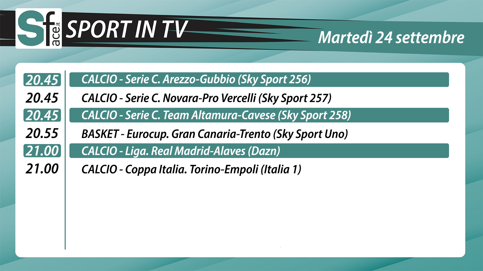 - 21:00 Atl. Madrid – Francoforte